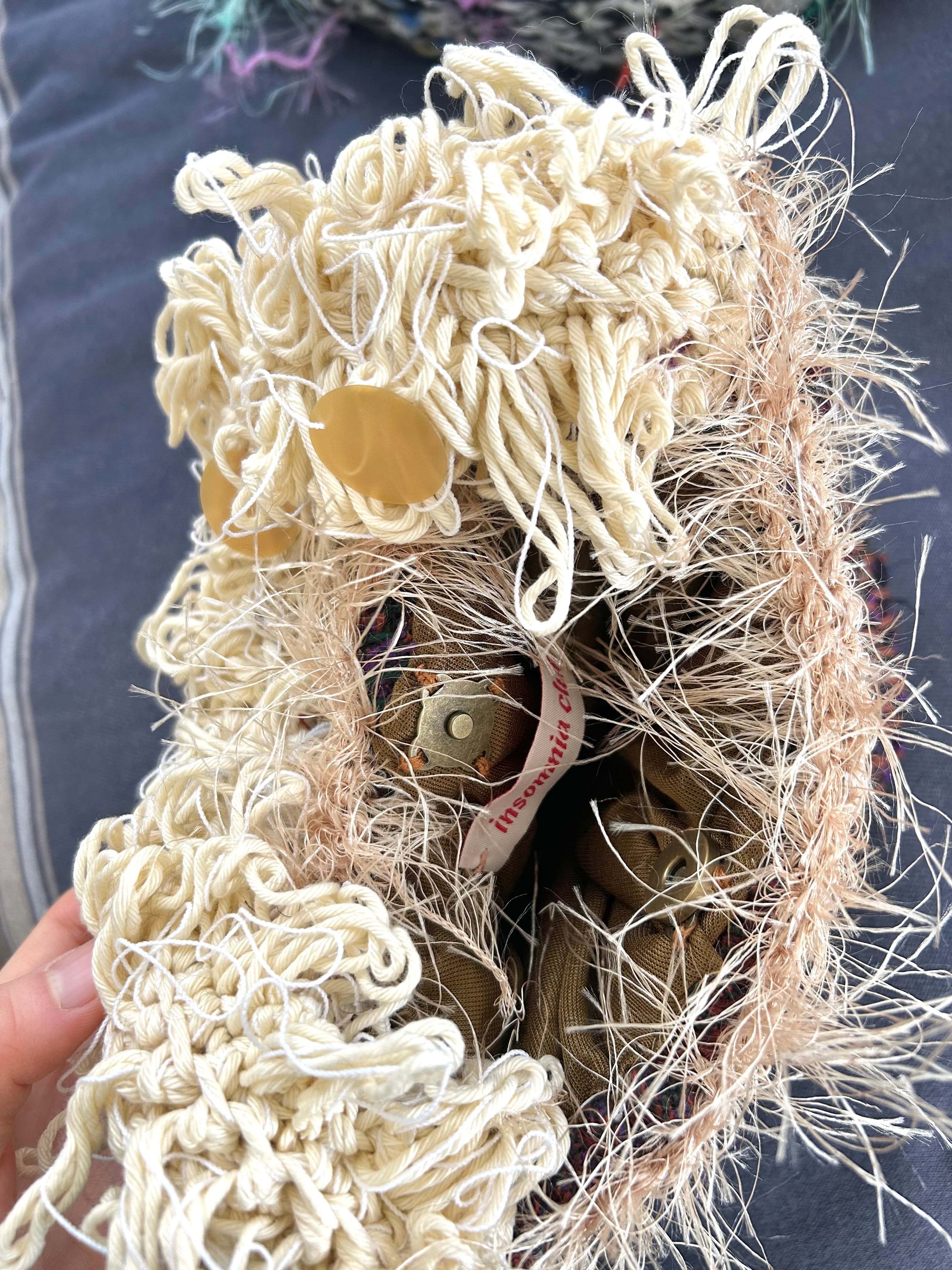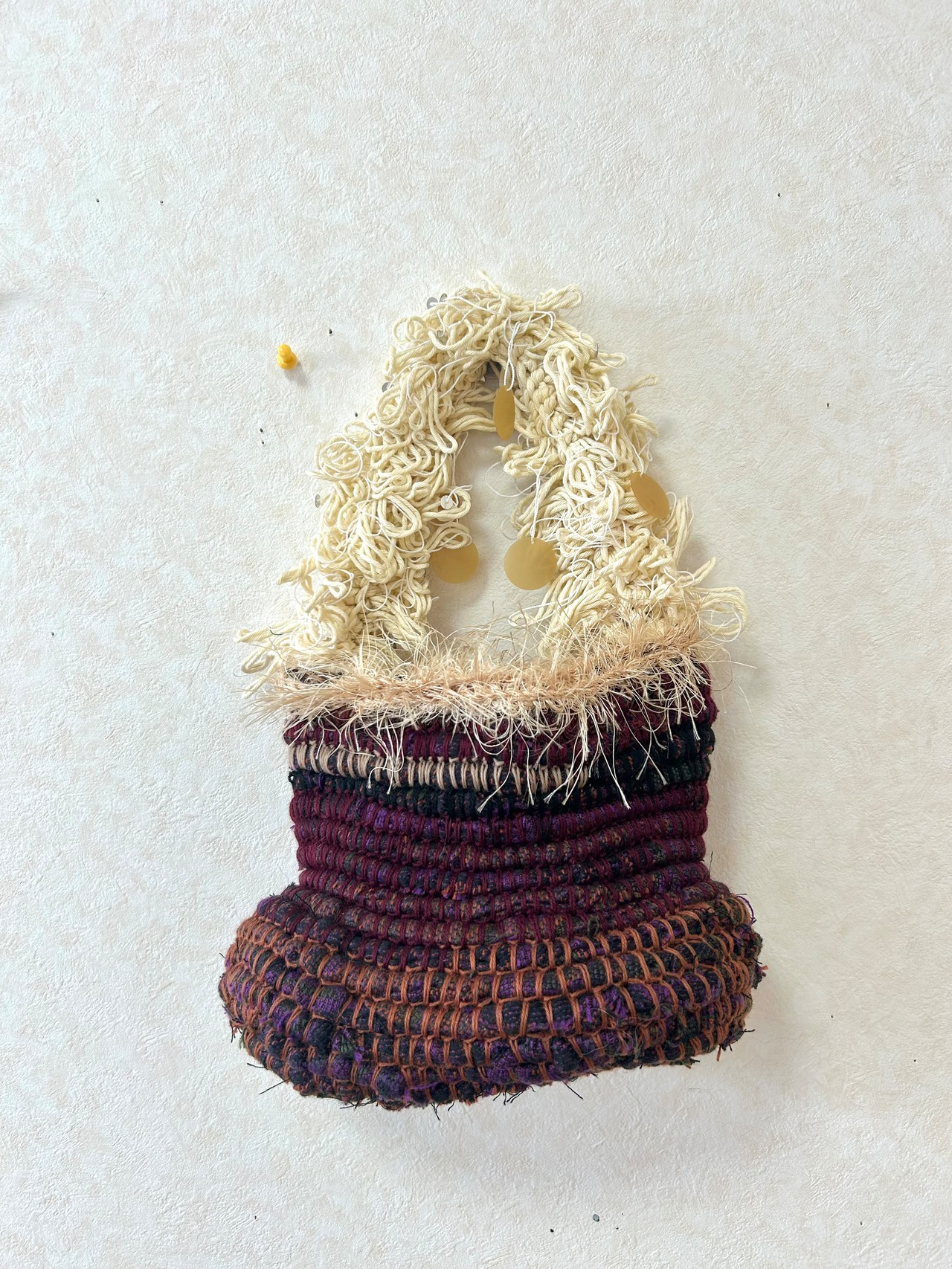 もう着なくなったTシャツや、個性的な素材の布、毛糸などの様々な素材からできたバッグになります。