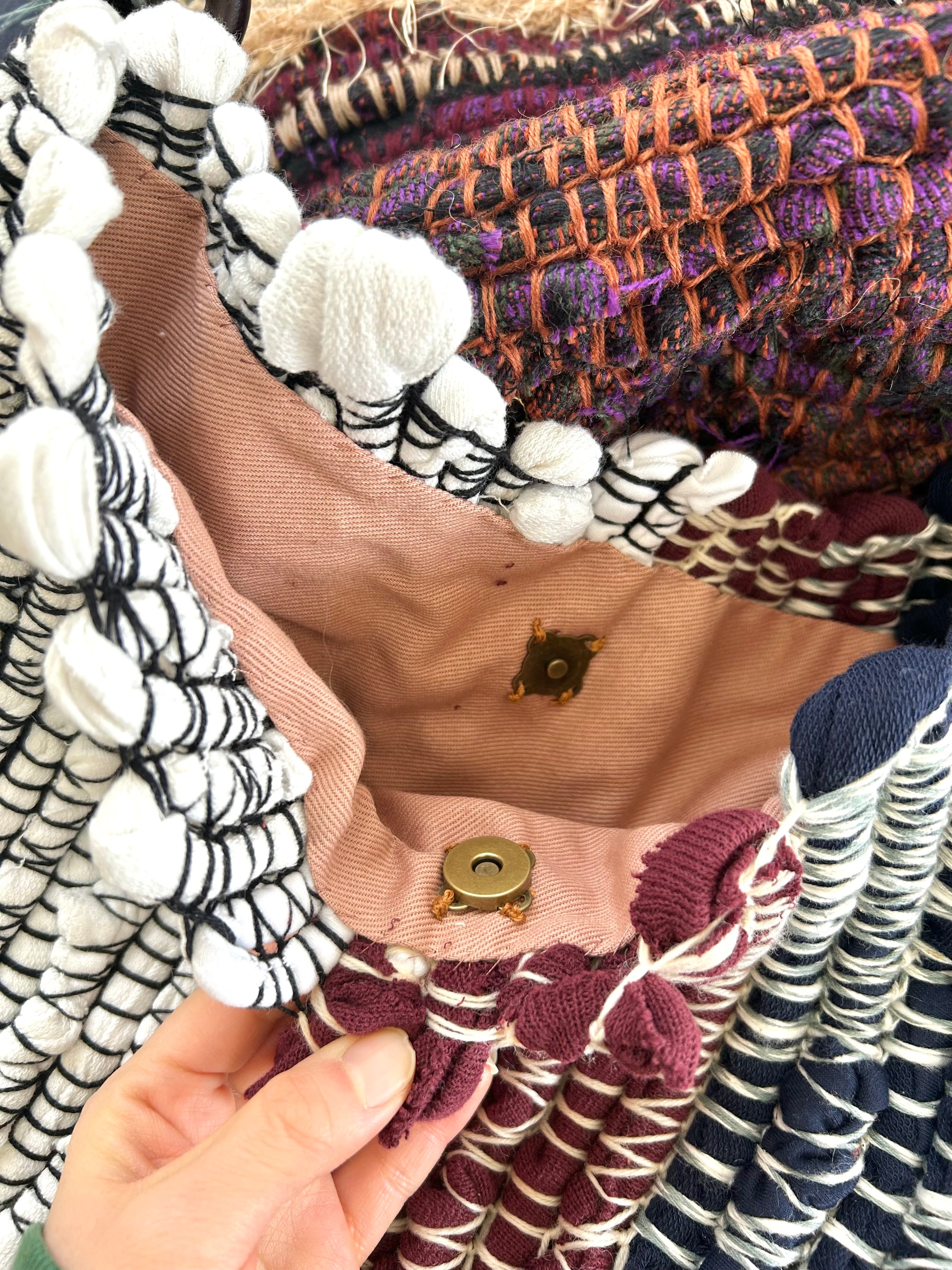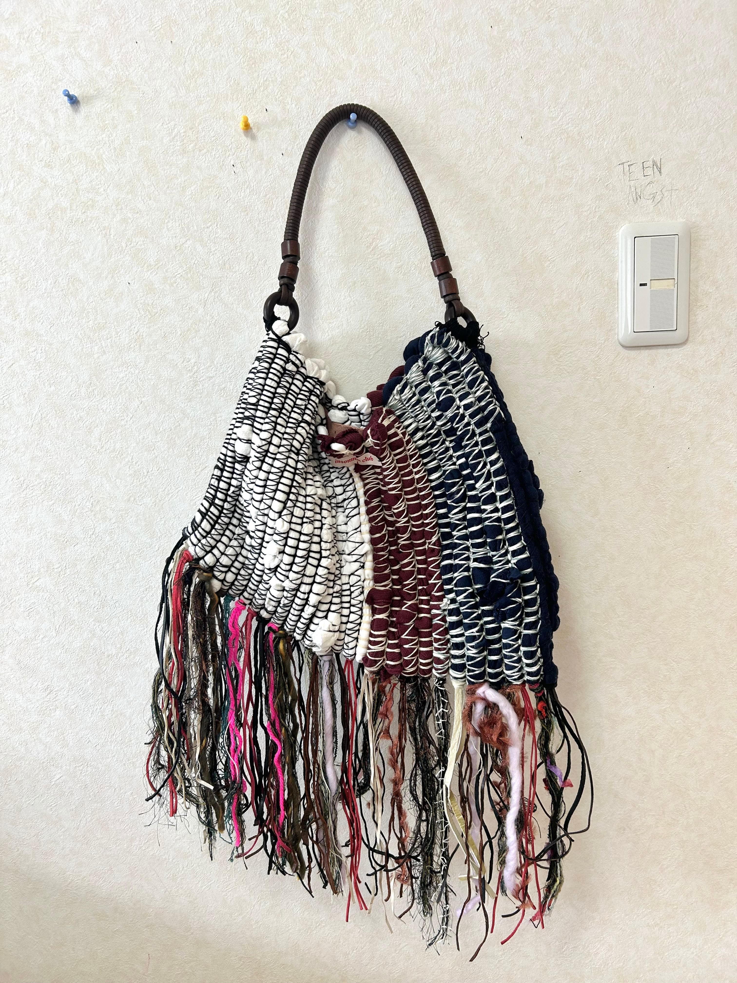 もう着なくなったTシャツや、個性的な素材の布、毛糸などの様々な素材からできたバッグになります。