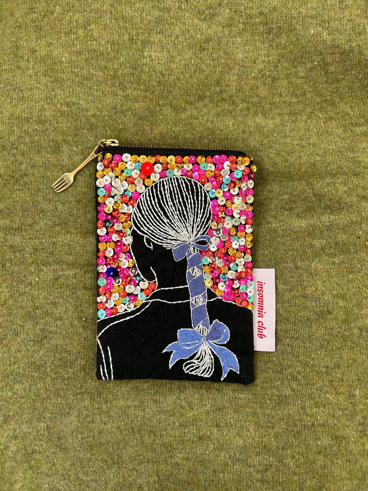 手刺繍でモチーフを表現し、スパンコールを敷き詰めたポーチになります。